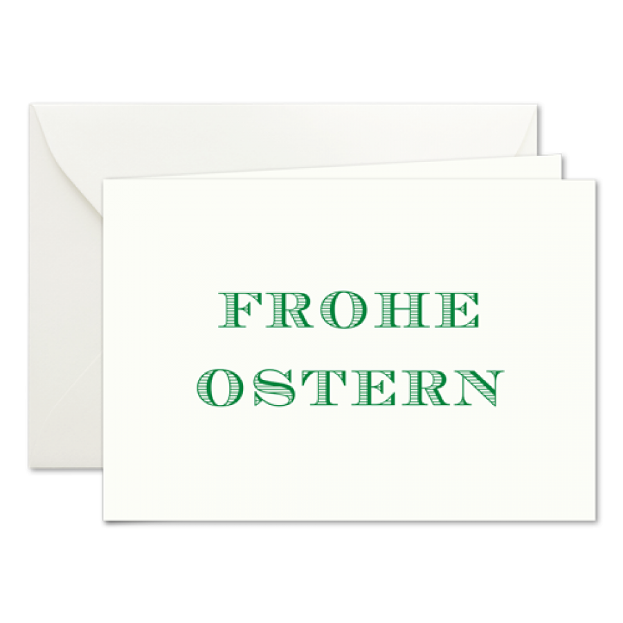 Frohe Ostern in Grün. Eine stilvolle Karte gedruckt auf unserem Opaline Spezialkarton im Format (130 x 90 mm). Eine tolle Geschenkidee, Elegant und hochwertig.
