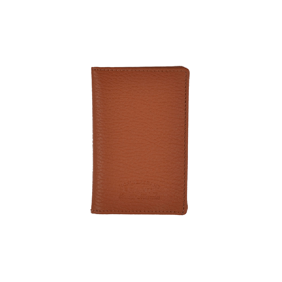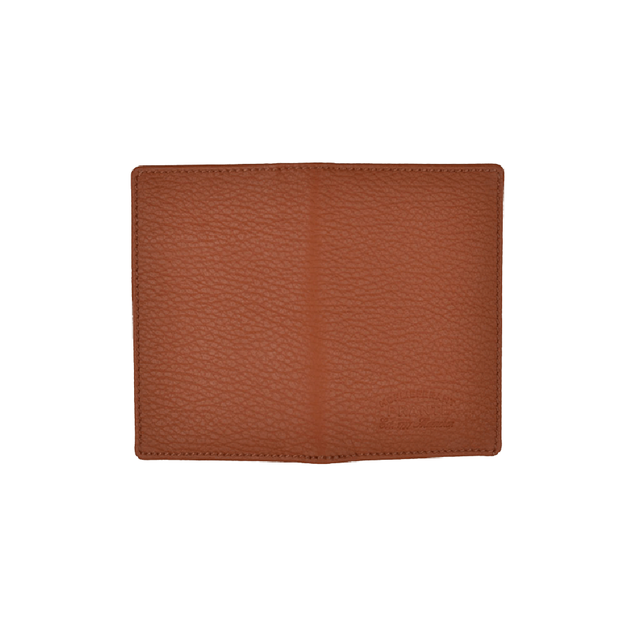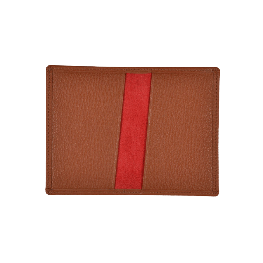 Klassischer und praktischer Visitenkartenhalter aus edlen cognacfarbenen Leder mit Innenvelours in hochrot
