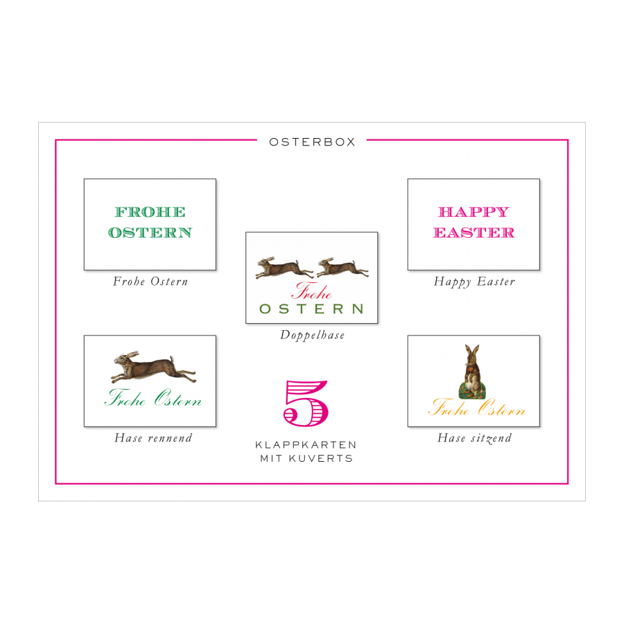 Die Osterbox - Klassisch beinhaltet 5 verschiedene Klappkarten mit Ostermotiven von Prantl, gedruckt auf hochwertigem Feinstkarton im klassischen Hausformat (130 x 90 mm). Eine tolle Geschenkidee, elegant und hochwertig.